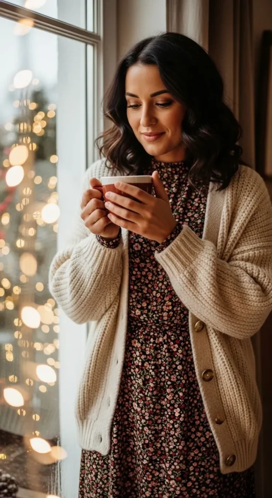 A thick cardigan turns any dress into a cozy outfit. Pick neutral colours like beige or cream — they go with almost anything. If it’s cold, wear tights and ankle boots. You can thrift vintage cardigans to save money and add character to your outfit.