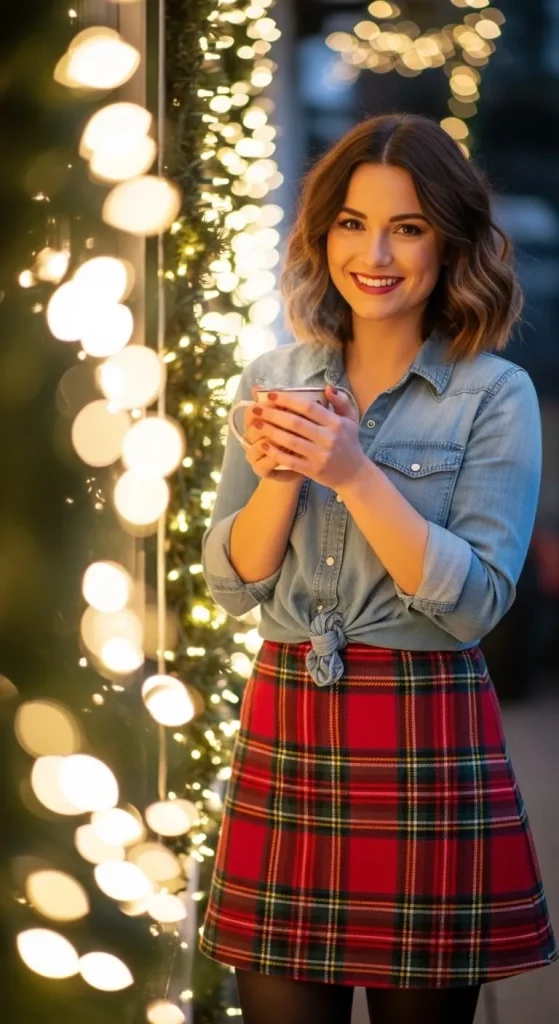 Pairing a denim shirt with a plaid skirt brings a casual holiday feel. Add tights and boots for warmth. Tuck the shirt in for shape or tie it at the waist. You can reuse both pieces year-round, making it practical and stylish.