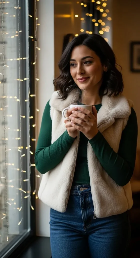 A faux fur gilet adds texture and instant holiday style. Layer it over a turtleneck or simple shirt. You can find affordable versions in high street shops or thrift stores.