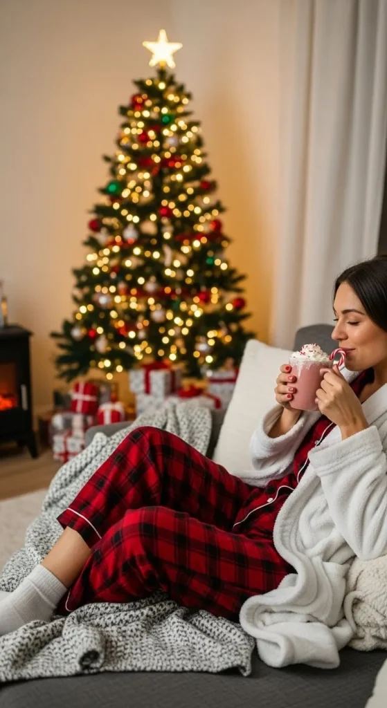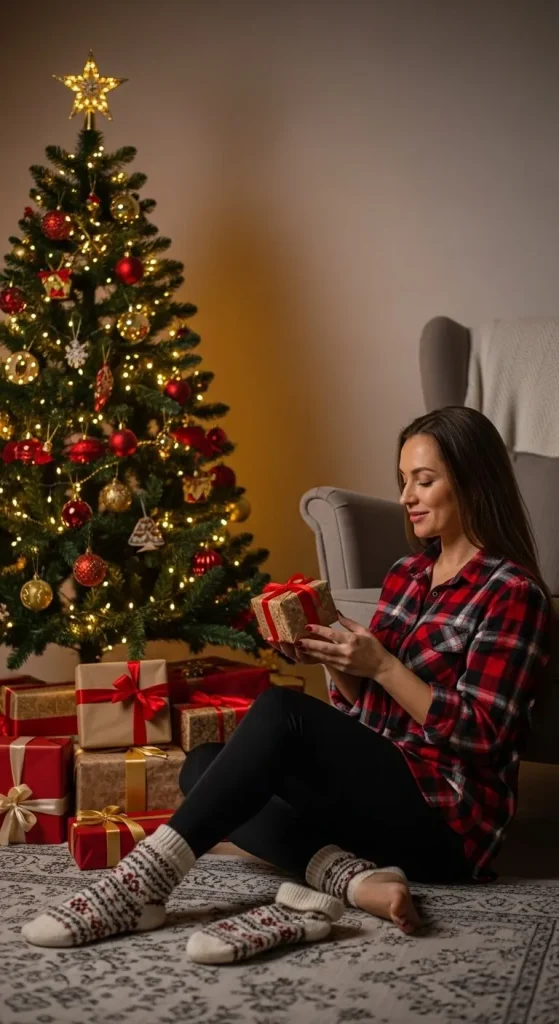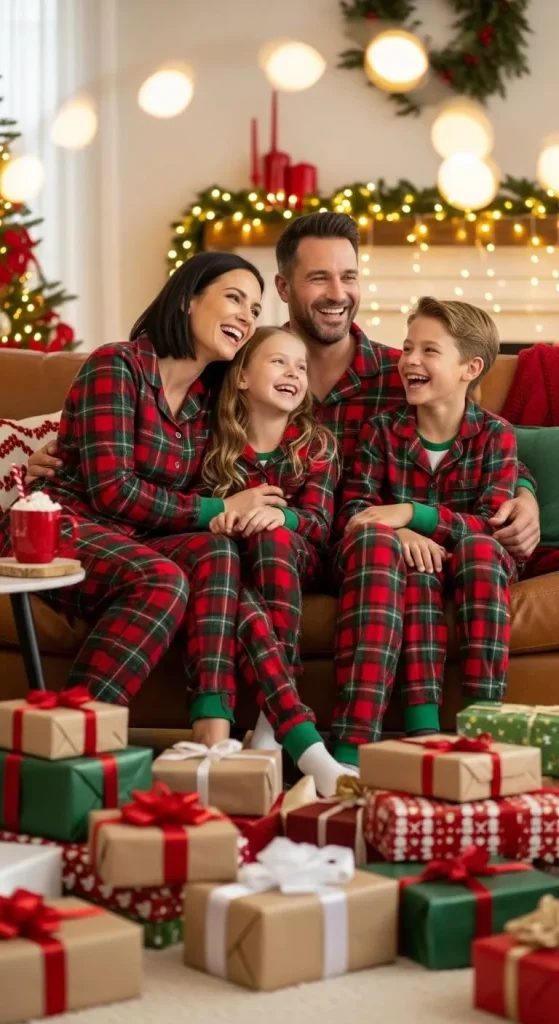 Matching pyjamas make the morning photos extra fun. Go for soft flannel or breathable cotton. You don’t need to buy new ones every year — reuse or mix patterns that match the same colour palette. Add fuzzy slippers to finish the look. It’s a simple, low-cost way to make your Christmas photos special.