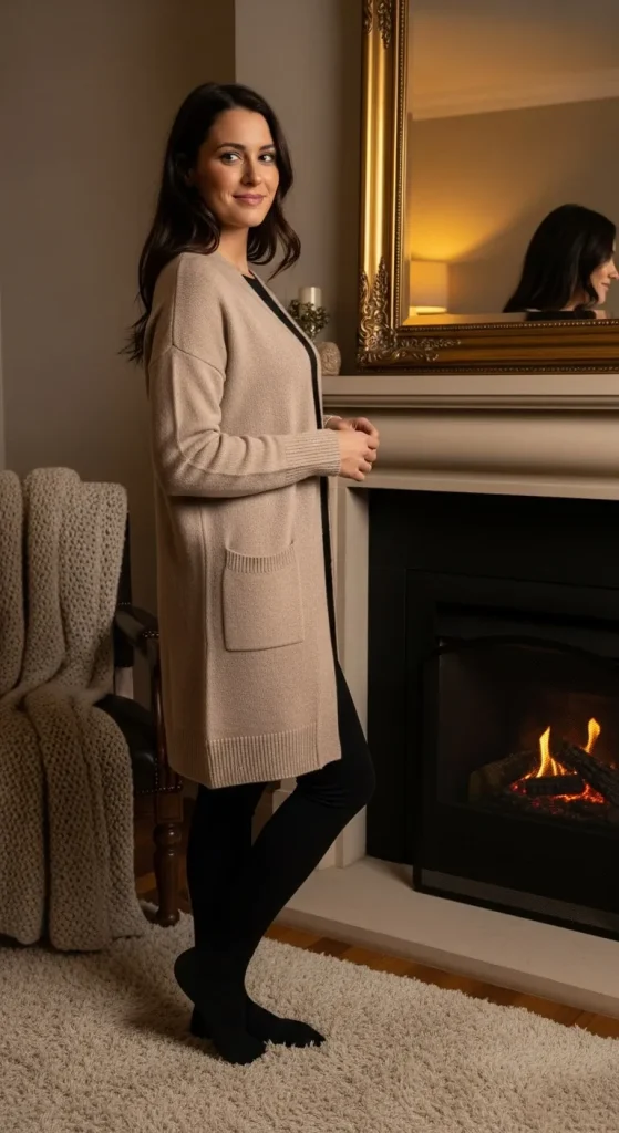 This outfit is perfect if you want to move around easily. Longline cardigans add a relaxed, layered feel. Keep colours simple — cream, grey, or blush. Add a small pendant or hairband for detail.