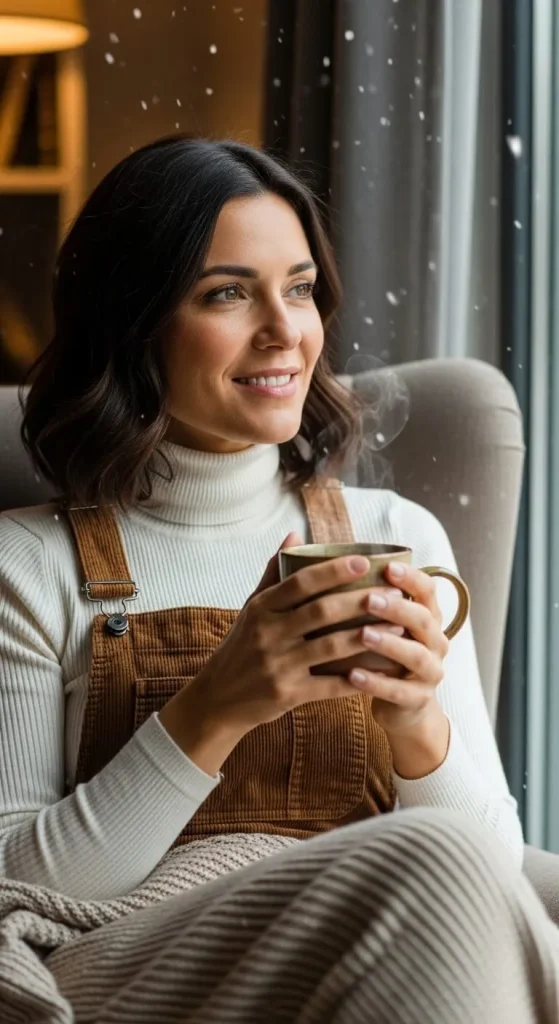 Dungarees are fun and relaxed. Go for corduroy fabric for warmth. Underneath, wear a long-sleeve tee or turtleneck. Add a beanie or knit scarf. This look feels playful and perfect for family gatherings.
