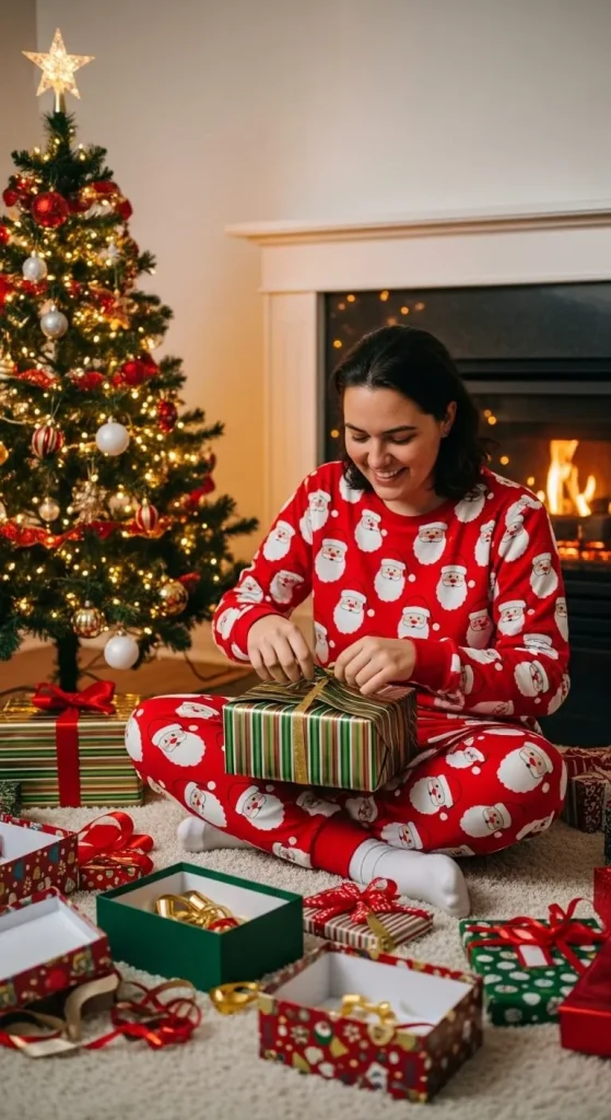 Fun and easy — Santa prints always bring cheer. You can find affordable sets in supermarkets or online. Pair with slippers or socks. Add a Santa hat if you want a laugh in the family photos.