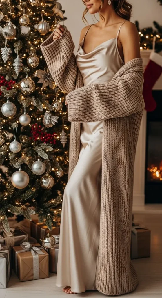 A satin slip dress feels festive but still relaxed when layered with a cardigan. You can style it with simple jewellery and flat sandals for comfort. Look for budget-friendly satin blends that drape nicely.