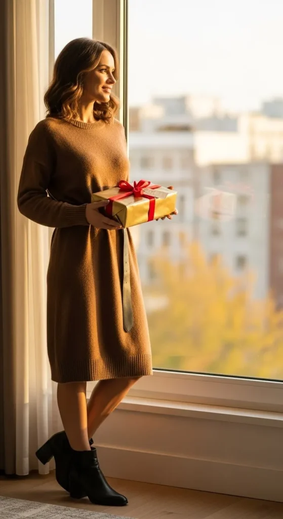 Sweater dresses are made for Christmas Day. Add a simple belt to give your figure some shape. Pair with boots or sneakers for all-day wear. You’ll feel cozy yet ready for family photos.