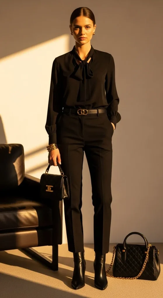 Simple, chic, and always in style. An all-black outfit lets your accessories shine. Add gold jewellery or a red lip. You can pull this together using basics you already own. Perfect for a last-minute dinner plan.