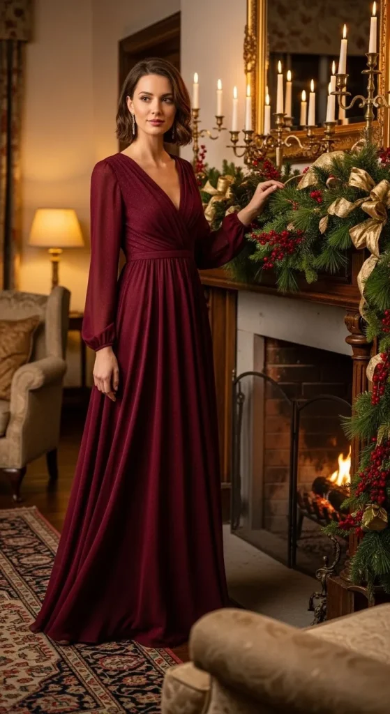 Burgundy feels rich and festive. Choose one with a flattering neckline. Add a slim belt for shape. Gold jewellery complements beautifully. You can find budget-friendly options online or reuse an old prom dress. Just style it with subtle accessories.