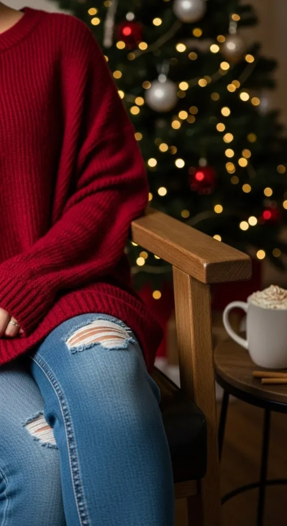 Relaxed yet festive. Perfect for a laid-back dinner or family movie night. Add red lipstick and small earrings. You can tuck in the sweater or tie it up for shape. Great for those who prefer comfort with style.