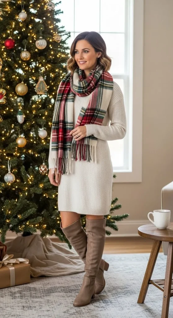 This look is perfect for a family gathering. The knit dress feels comfortable yet elegant. Add tall boots to balance the outfit. You can repurpose your everyday sweater dress — just add a belt to shape it. Layer with a scarf or coat for warmth. Neutral tones keep it stylish and effortless.