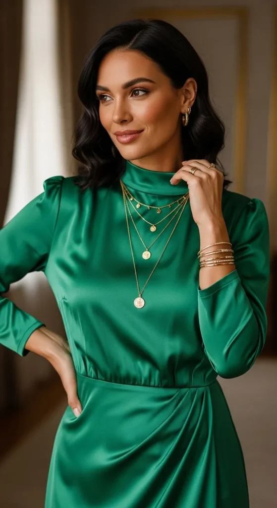 Green reflects the Christmas mood perfectly. Choose satin or crepe fabric. Style with nude or gold heels. You can reuse any green dress — just accessorize differently. A metallic clutch adds polish. Keep makeup warm and glowy.