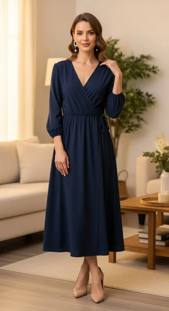 Elegant and timeless. Wrap dresses flatter all body types. Navy is a calm, beautiful choice for evening gatherings. Add pearls or silver jewellery. For a thrifty option, thrift stores often have wrap dresses at great prices.