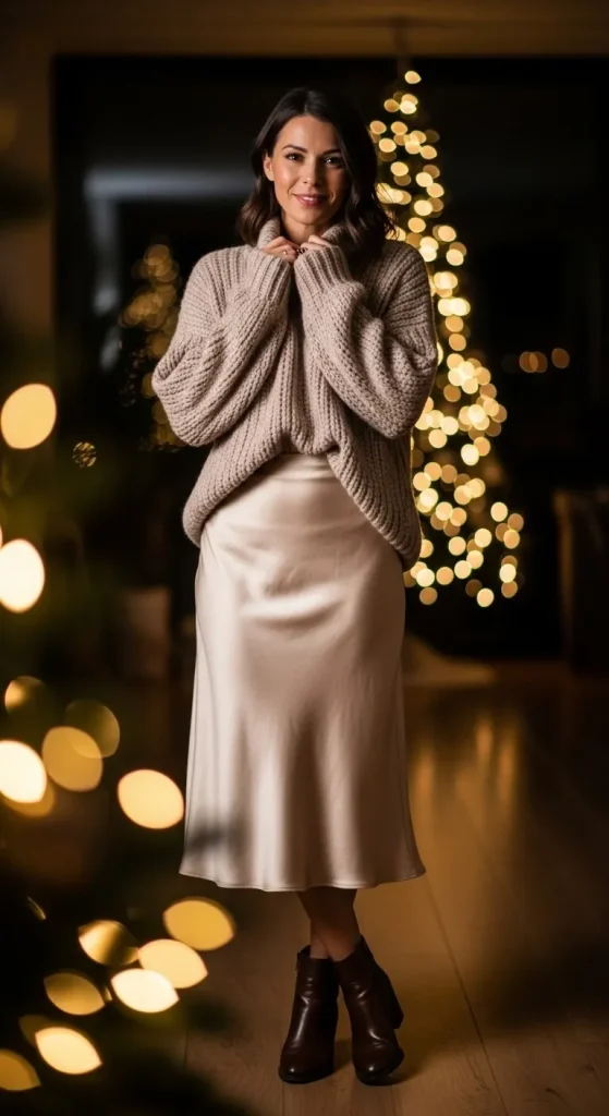 The perfect mix of cozy and dressy. Satin skirts flow beautifully. Tuck in a chunky sweater for contrast. You can use any midi skirt you already have. Add a long necklace or belt to tie it together. It’s great for dinner and lounging after.