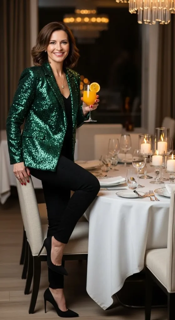 Add sparkle the easy way. A sequin blazer instantly upgrades jeans. Choose slim or straight cuts for balance. Add a simple top underneath. For a DIY idea, glue sequins on an old blazer or jacket. Affordable and unique.