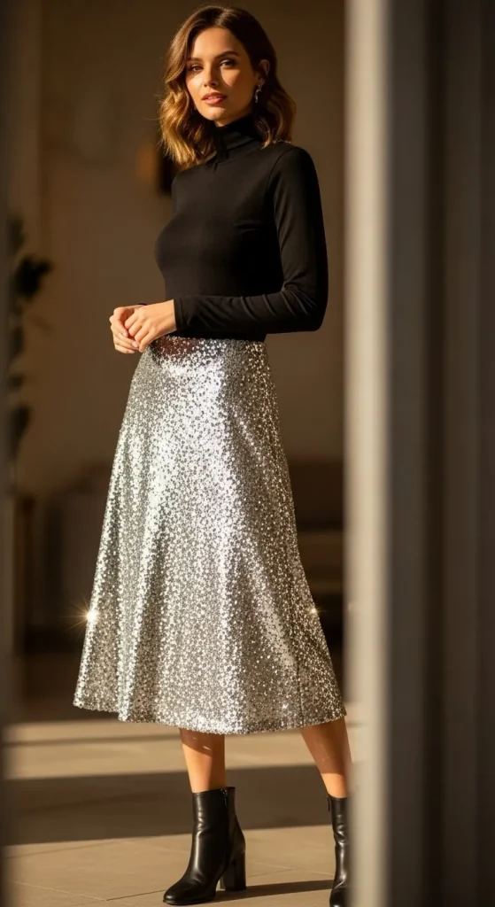 Sparkle without going overboard. A sequin skirt adds just enough shine. Pair with a plain black or cream turtleneck for balance. If you have an old sequin dress, cut it into a skirt. That’s a simple DIY transformation. Add ankle boots and you’re party-ready.