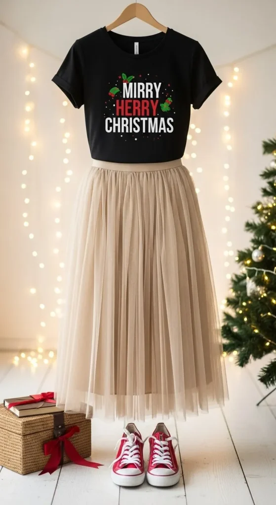 Playful and comfy. Tulle skirts add volume and charm. Pair with a graphic tee for contrast. Knot it at the waist. Add sneakers for a laid-back vibe. Perfect for casual dinners or movie nights at home.