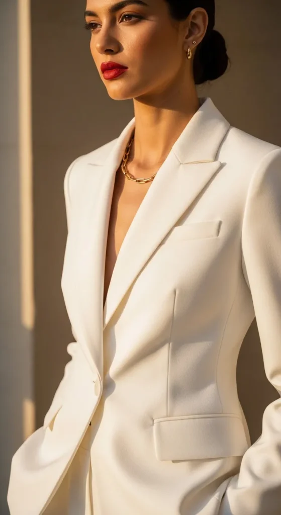 9. White Suit with Red Lipstick