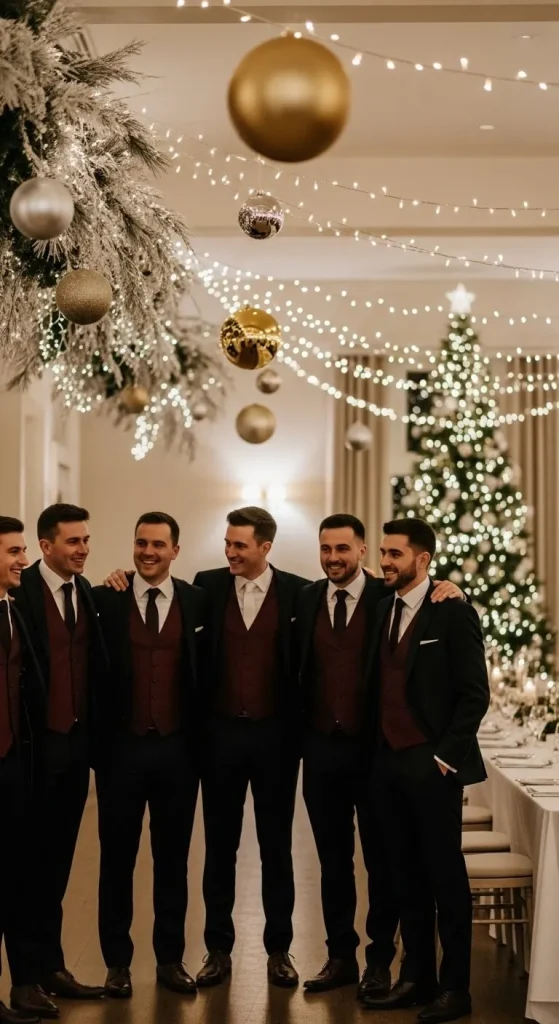 Most groomsmen already own a black suit, making this a very affordable option. Just coordinate the accents ahead of time so everyone matches. If red feels too bright, go for burgundy. It’s softer and still fits the holiday palette.