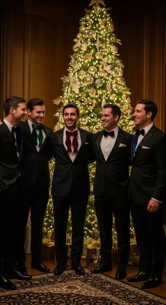 All-black outfits feel sharp and modern. Add dark green ties or pocket squares to tie into the Christmas theme subtly.