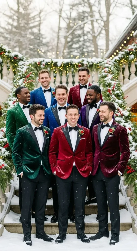Let each groomsman wear a different shade of green while keeping the suit cut the same. This creates visual depth while staying within the Christmas palette.