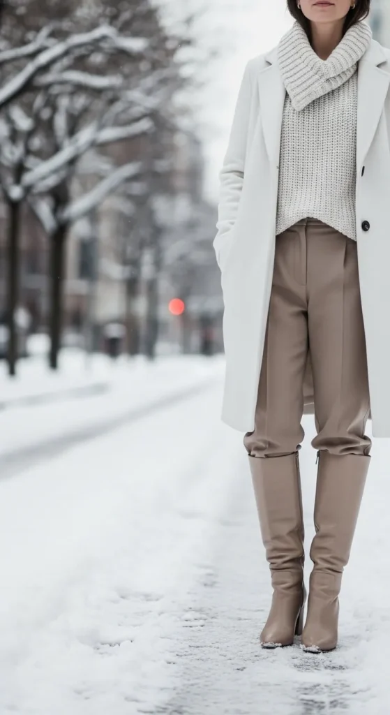 Faux leather pants bring an instant edge. Pair with a soft knit in beige, cream, or blush. Add loafers or ankle boots. These pants are affordable and durable, often looking pricier than they are. To soften the look, go for lighter tones and minimal makeup.