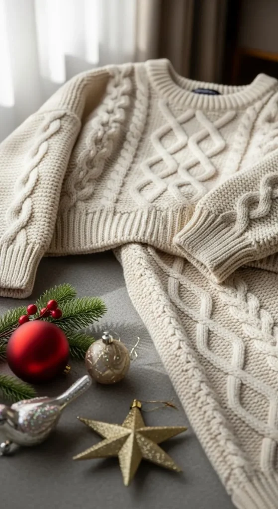 This pairing feels effortless and elegant. The mix of cozy knit and silky texture makes it perfect for holiday dinners. Add minimal accessories and soft waves in your hair. It’s stylish, simple, and comfortable all at once.