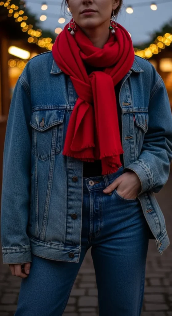 Denim works for holiday looks too. Pair a fitted denim shirt with jeans in a different shade. Add a red scarf or statement earrings for a Christmas touch. Keep hair soft and makeup natural.