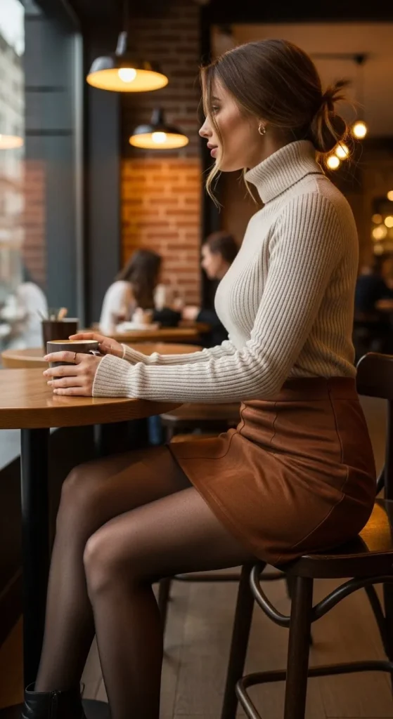 A white turtleneck is a winter staple that never goes out of style. Tuck it into a plaid mini or midi skirt for an instant festive upgrade. Add sheer tights and ankle boots for comfort and charm. For extra warmth, layer with a cropped jacket. This outfit is easy to pull together and perfect for a holiday brunch or Christmas Eve dinner.