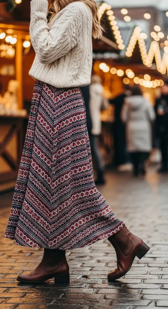 Mix flowy and fitted. Tuck your sweater into a long skirt for shape. Add boots for comfort and style. Play with prints like floral or plaid for personality.