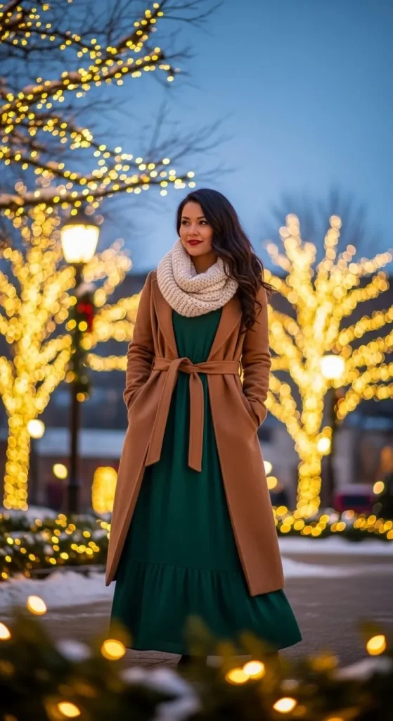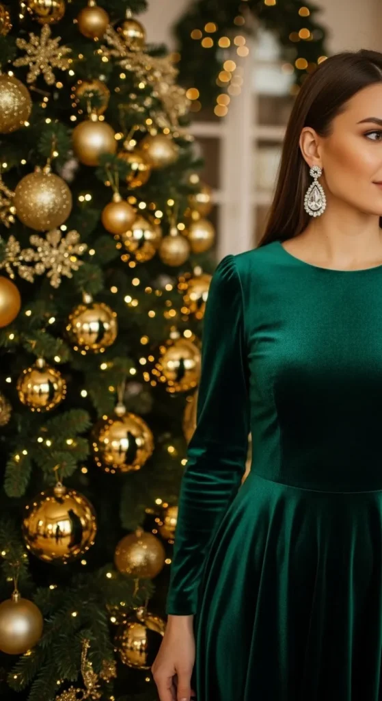 A green sweater dress feels both cozy and festive. Pair with boots and a belt to define your waist. Add gold accessories for warmth. This look is simple yet stylish for gatherings at home.