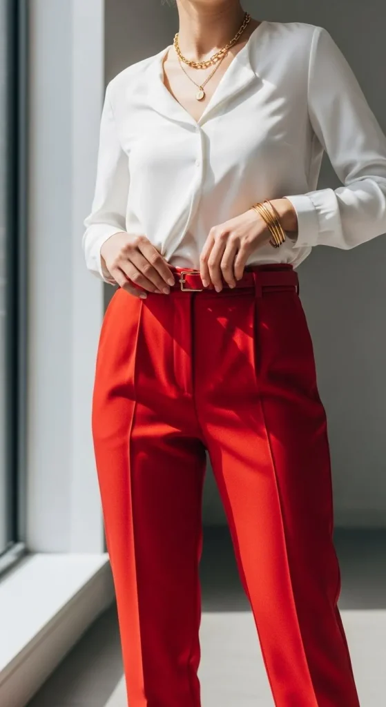 Bold yet simple. Red trousers look festive and refined when matched with a crisp white blouse. Add gold or nude accessories to soften the contrast. This outfit works great for office parties or casual dinners.