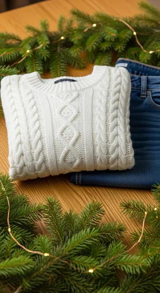 A white cable-knit sweater always feels right in December. Pair it with dark jeans for a clean, comfortable outfit. Add ankle boots or loafers. A plaid scarf or red lipstick adds a holiday touch without buying new clothes. This look is great for casual staff parties.