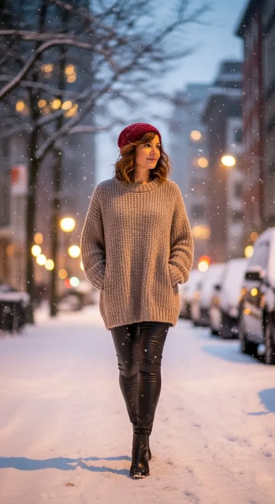 Pair an oversized cable knit sweater with classic black leggings for the ultimate cozy combo. It’s warm, stretchy, and easy to move in. Add fuzzy socks and a messy bun for that “home for the holidays” vibe. You can thrift chunky knits or borrow one from your dad’s closet for free comfort. For a quick upgrade, tuck in the front slightly and wear simple gold hoops. It’s low effort but feels stylish without trying too hard.