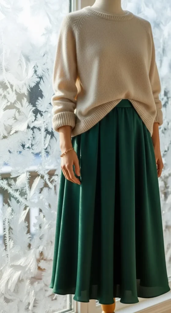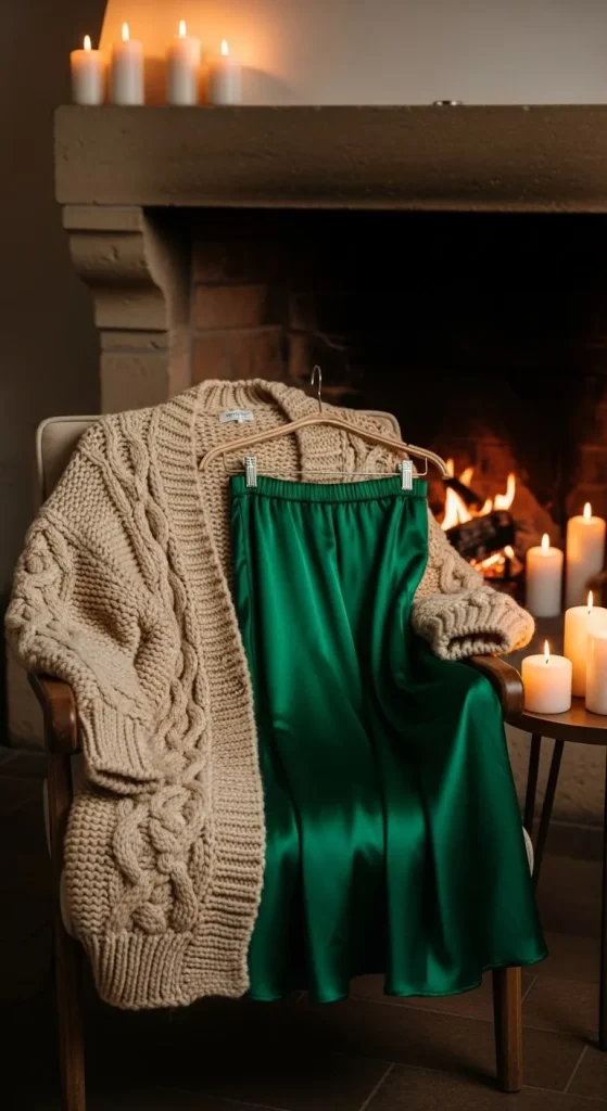 Mix textures with a chunky cardigan and midi skirt combo. It’s feminine, warm, and easy to layer. Add a tank top underneath for flexibility and pair with knee-high socks. For a budget trick, reuse your summer satin skirt with thicker tights underneath. The balance between flowy and cozy feels just right for small gatherings.