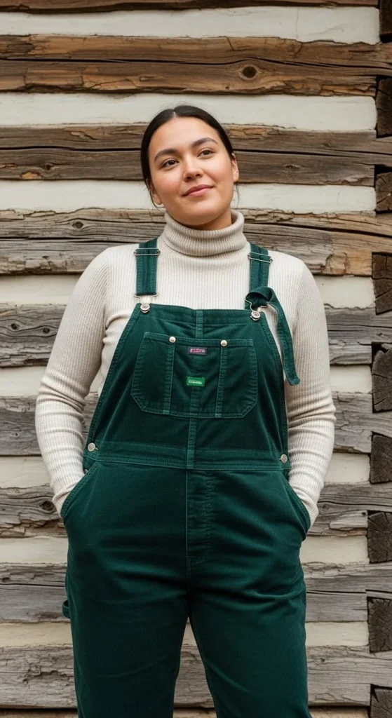 Corduroy is soft, warm, and nostalgic. Pair corduroy overalls with a turtleneck for a playful holiday outfit. Choose colours like tan or deep green. Add wool socks and boots for warmth. If you can sew, cut and re-stitch old pants into short overalls.