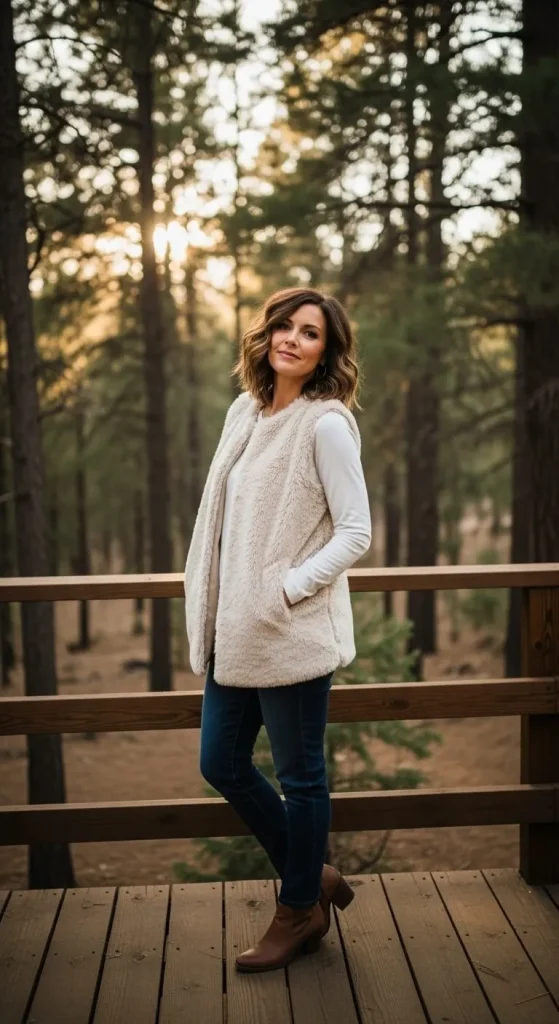 Add instant warmth and flair with a faux fur vest. Layer it over a long-sleeve top or turtleneck. Pair with skinny jeans and boots for a cozy outdoor outfit. You can find affordable faux fur pieces at thrift stores. It’s perfect for winter walks or sipping cocoa outside by a fire pit.