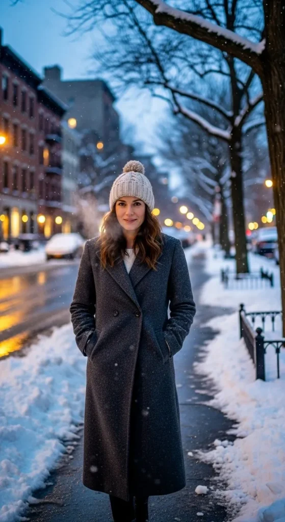 A long wool coat instantly makes any outfit feel warm and elegant. Add a matching beanie and scarf for complete coziness. Stick with neutral or monochrome tones—it looks intentional and stylish. Keep an eye on end-of-season sales for quality coats at half price.