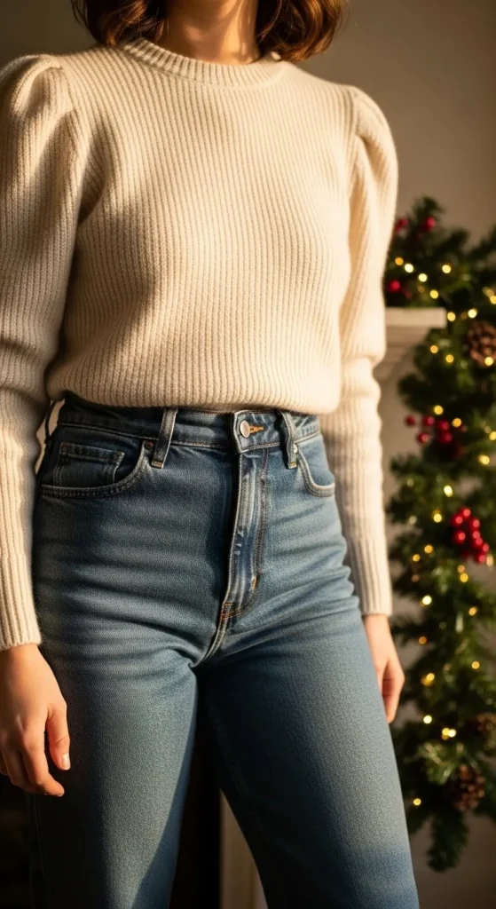 A turtleneck sweater paired with wide-leg pants gives off an effortless cozy-chic feel. Choose soft materials like cashmere or brushed cotton. Add loafers or clean sneakers for a laid-back touch. You can DIY the look by layering a simple turtleneck under old knit vests. Keep the palette light—think winter whites and warm beiges—for that calm holiday tone.