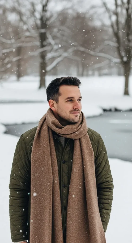 A quilted jacket is a cozy layer that never fails. Add a scarf in a contrasting colour to brighten things up. Stick to earthy tones for that winter comfort mood. You can thrift one easily or reuse your fall jacket with layers underneath.