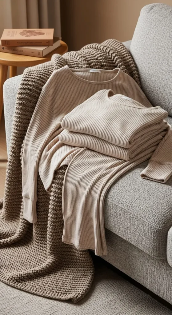 A ribbed lounge set feels like pyjamas you can wear all day. Choose neutral shades for a sleek touch. Add delicate jewellery or fuzzy socks. If you’re crafty, cut an old sweater into a cropped top and match it with soft joggers. It’s comfort with a hint of polish.