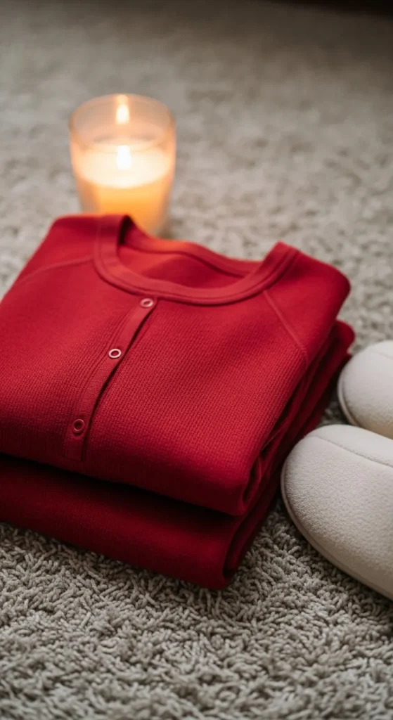 Thermal sets always feel comfortable and warm. A bright red option fits the festive theme. Add slippers in a soft brown or cream shade. If you want more warmth, layer a robe on top. A simple low-cost idea is to add tiny iron-on snowflakes to the sleeves for fun seasonal flair.