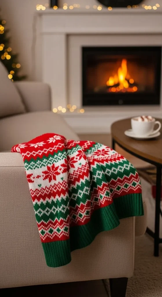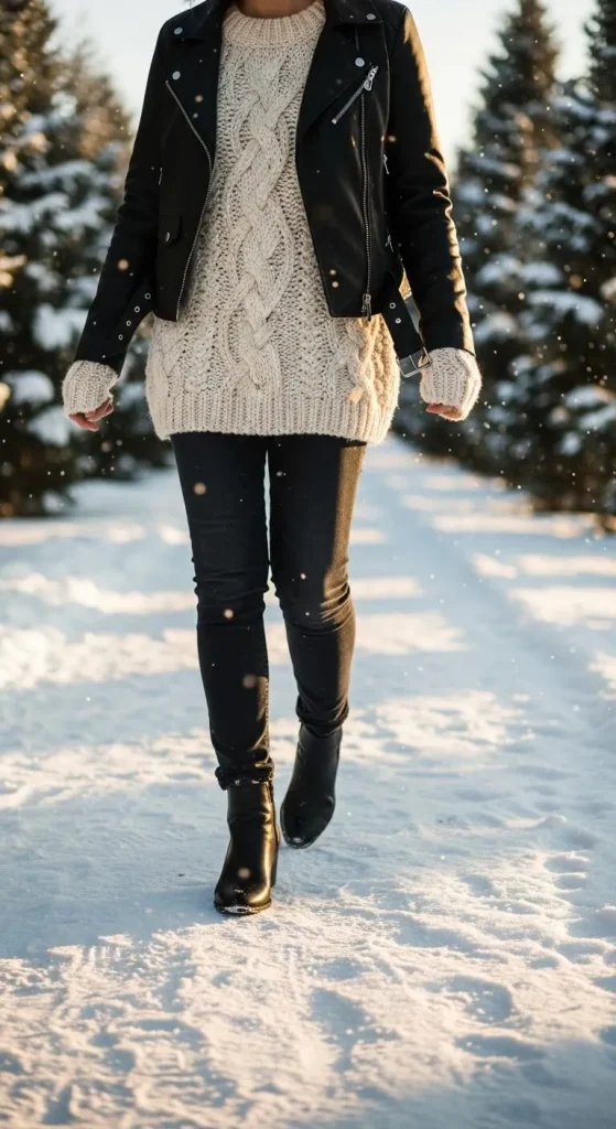 For an edgy holiday look, layer your festive sweater under a leather jacket. This combo gives a street-style twist to your cozy holiday look. Pair with skinny jeans and ankle boots for a sleek outfit that’s perfect for casual holiday parties or outdoor events.