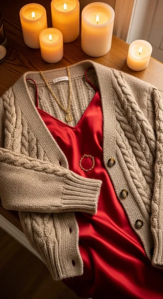 A button-up cardigan over a slip dress offers a comfortable yet elegant combination. The slip dress brings a touch of luxury, while the cardigan keeps you cozy. Add tights and your favorite boots for added warmth. This outfit works great for holiday gatherings where you want to feel dressed up but still be able to move easily. Plus, it’s budget-friendly and can be worn long after the holidays.