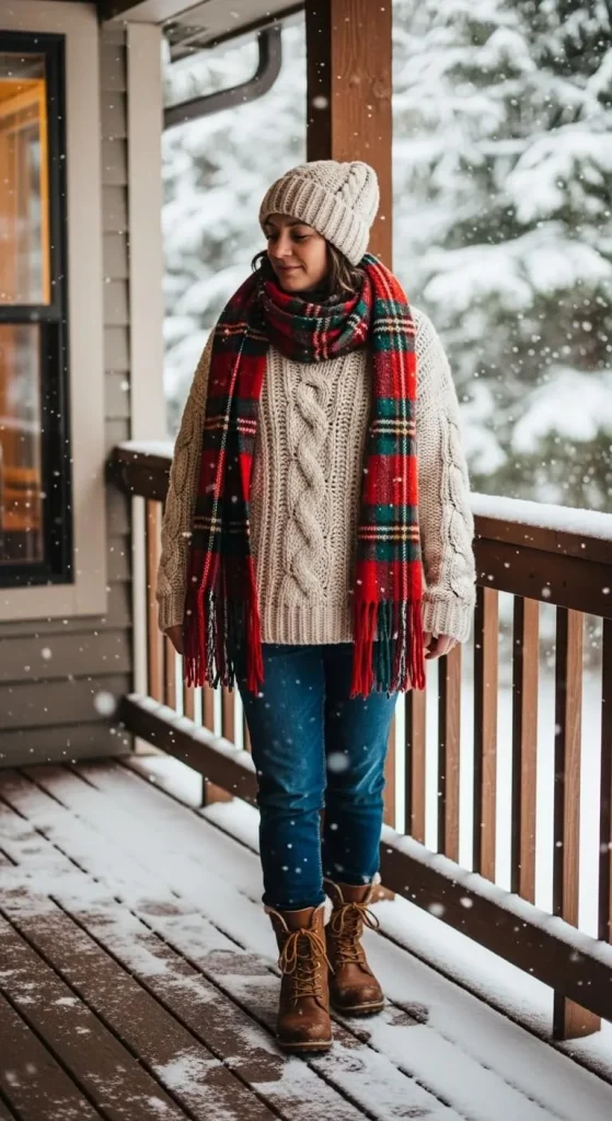 Chunky sweaters are a must-have for the colder months, and when paired with a plaid scarf, you instantly achieve a festive yet laid-back look. Choose a sweater in neutral tones and add a pop of holiday color with the scarf. It’s a practical and stylish option for running errands or casual gatherings. Throw on some comfy boots to keep your feet warm!