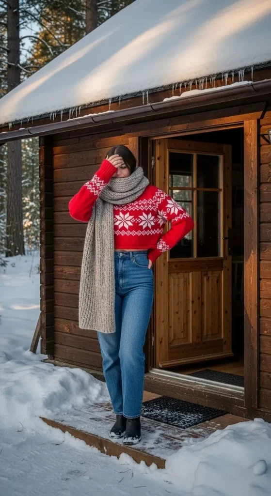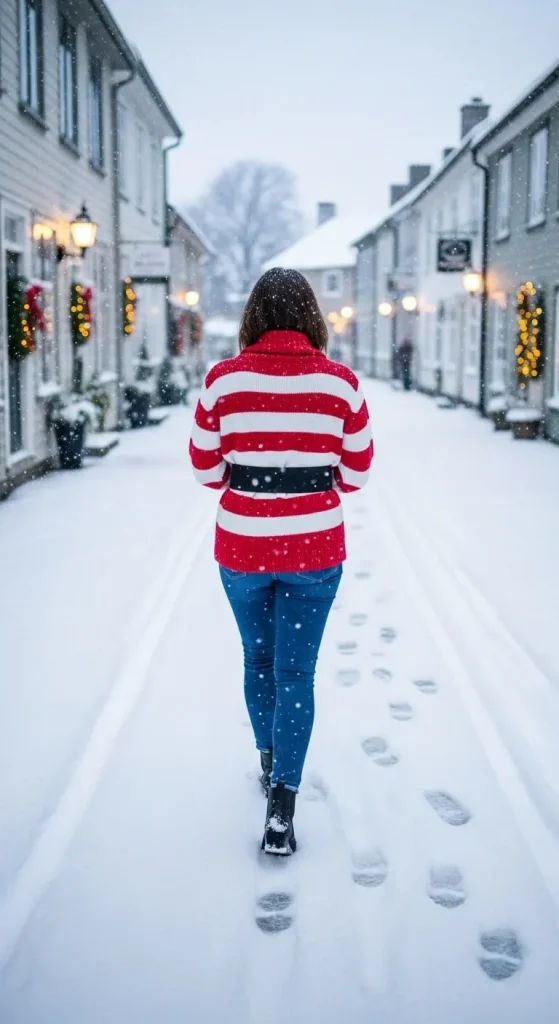 For a more casual yet festive vibe, try pairing your sweater with a denim skirt. This outfit is easy to dress up or down. Add tights for warmth or keep it simple with bare legs. Pair with ankle boots for a comfortable look that’s perfect for a festive brunch or casual outing. This is a budget-friendly style that offers flexibility while still embracing the holiday spirit.