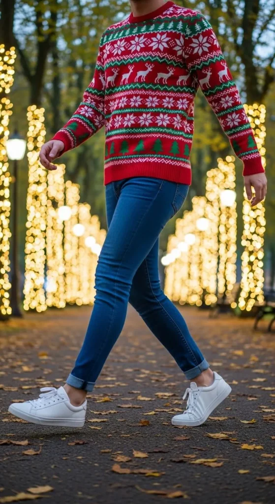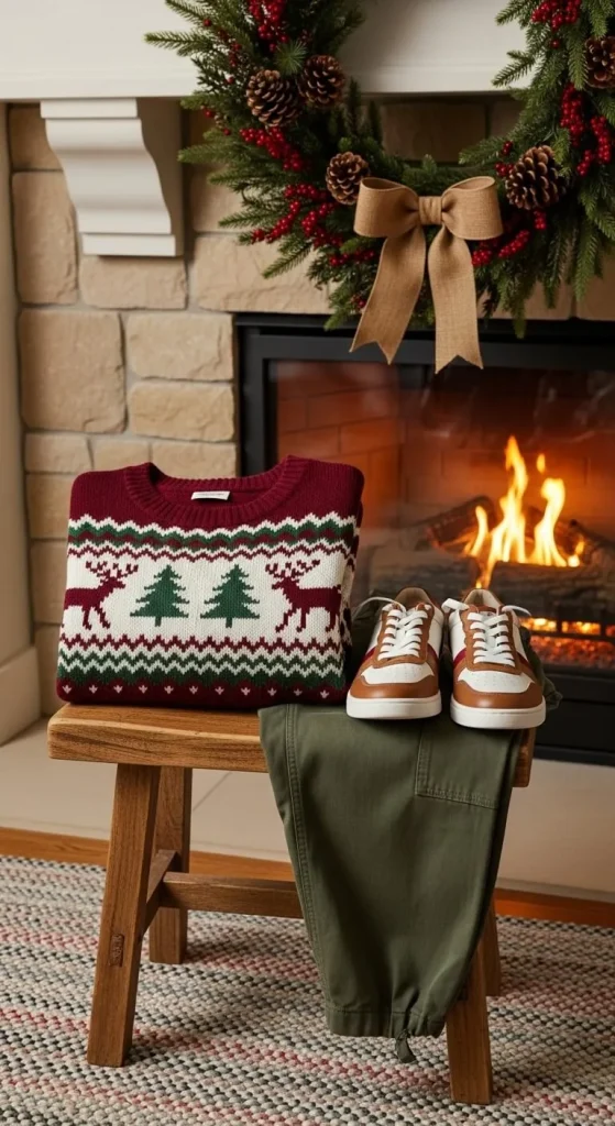 Pair your festive sweater with cargo pants for a laid-back, utilitarian vibe that still feels festive. Choose a sweater with a fun pattern like reindeer or snowflakes, and complete the look with sneakers. This outfit is perfect for those who want a mix of comfort and style, whether you’re heading out for a winter walk or hosting a casual holiday gathering.