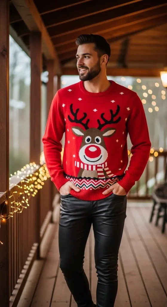 If you want to add a modern twist to your festive look, pair a graphic sweater with faux leather pants. This combo brings an edgy element to the holiday season while staying cozy. A statement sweater with a fun holiday design, such as reindeer or snowflakes, will make the outfit playful and festive. Keep your footwear simple with booties, and you’re ready for anything from a Christmas dinner to a night out.