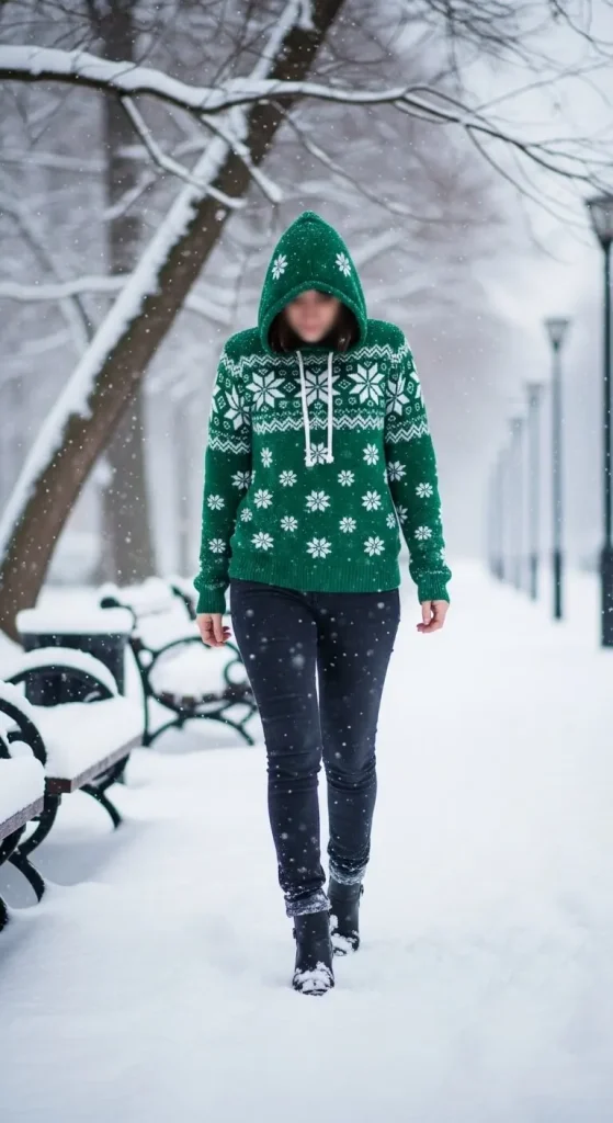 A hooded sweater adds an extra layer of warmth and style. Combine it with skinny jeans for a streamlined look that’s easy to wear. Whether you’re strolling around a holiday market or heading out to a family gathering, this combination keeps you cozy and chic. Add a cute beanie and winter boots for a practical and stylish ensemble that won’t let you down.
