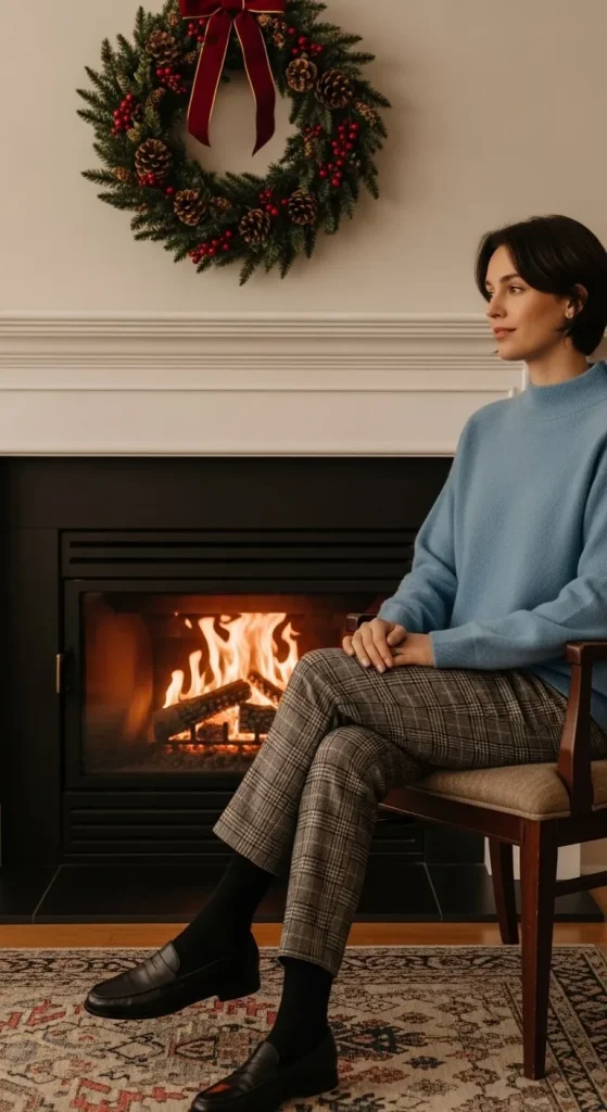 Pair a mock neck sweater with plaid pants for a sophisticated yet cozy look. The mock neck adds extra warmth, while plaid pants add a festive touch. This outfit is perfect for work holiday parties or a classy dinner. Pair with loafers or ballet flats for added comfort.