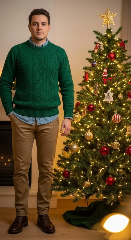 Layer a cozy sweater over a chambray shirt for a stylish and practical look. This outfit is great for those colder days when you need extra warmth without sacrificing style. Pair with khaki pants or jeans and brown boots for a balanced look that’s perfect for casual holiday events.