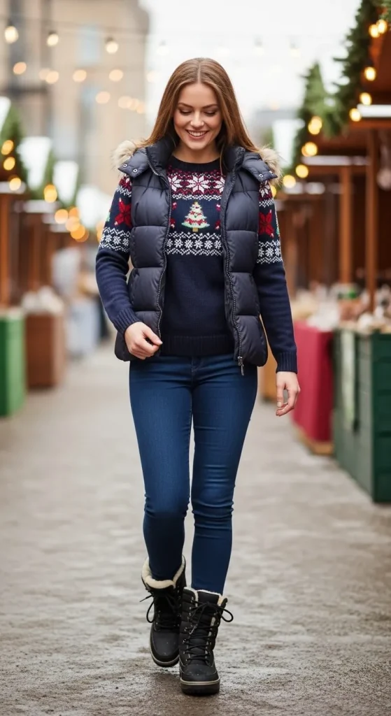 Layering a festive sweater under a puffer vest is the perfect way to stay warm and stylish. The vest adds extra insulation, while the sweater provides that cozy, festive vibe. This combination is ideal for outdoor activities like ice skating or attending a holiday market. Complete the look with boots and a knitted beanie.